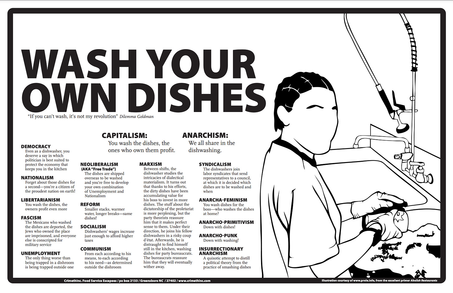 ✭ When thinking about this question, as the CrimethInc. graphic established, it’s always important to consider who takes out the trash—and provides care to others—now. Thankless, dirty, and emotionally taking jobs are disproportionally pushed into queer, femme, POC, and low-income people in today’s society—especially child and elder care. Statistically, housework (including, yep, the trash) is disproportionally pushed onto women and femmes—and not only the physical labor aspect, but the mental load. It’s not as if a patriarchal, statist society has discovered the perfect division of household labor whereas anarchy has no good solution. In a statist society, the most marginalized people take out the trash.